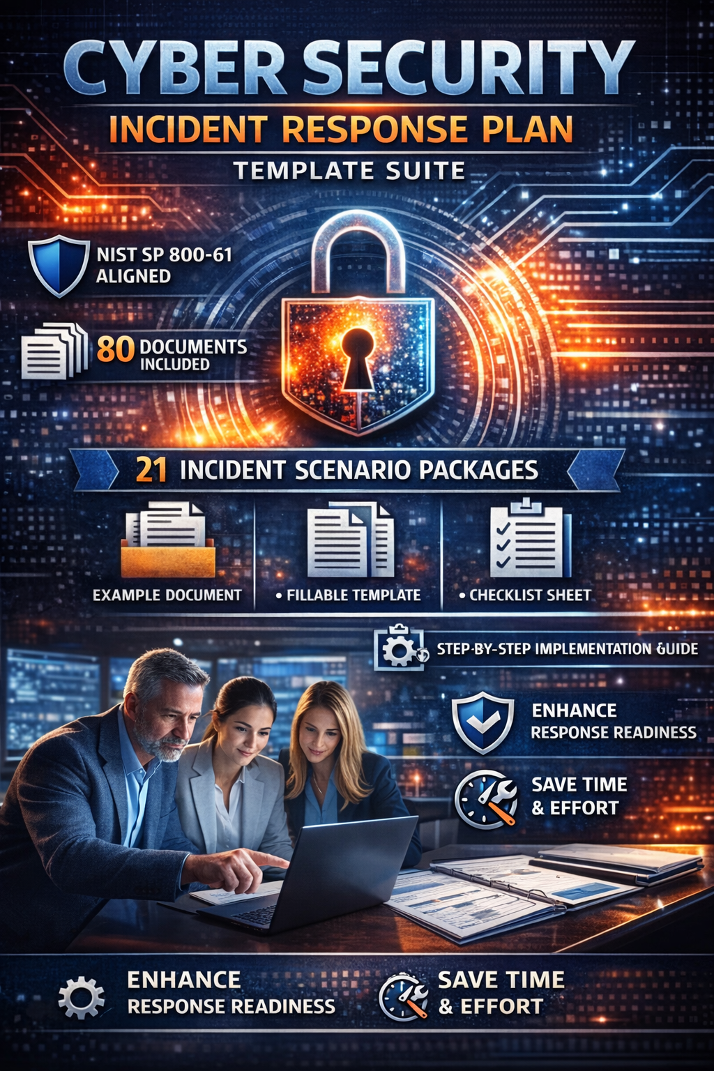 Cyber Security Incident Response Plan Template Suite, a comprehensive documentation and planning package designed for organizations that want to create or upgrade a formal incident response capability without starting from a blank page. The suite is intended for organizations that use NIST SP 800-61 as an incident response benchmark and includes governance, plan, procedure, checklist, communications, and tracking documents to support the development of a repeatable cybersecurity incident response program.